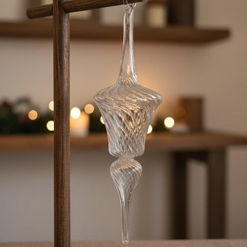 Hand-blown Egyptian glass ornaments featuring a striking lantern swirl design that captures light beautifully. Each piece is crafted by skilled artisans using traditional techniques, resulting in crystal-clear ornaments with distinctive character. The transparent glass complements any holiday décor scheme, while the intricate swirls evoke winter's delicate beauty. Lightweight and easy to hang, these ornaments work equally well on trees, wreaths, or garlands. As handmade art, slight variations and imperfections are natural and add to each piece's authenticity. Light refraction creates subtle color shifts depending on your display environment, making every ornament uniquely captivating.