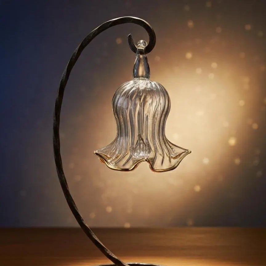 Each Crystal Glass Bell represents a masterwork of traditional Egyptian glassblowing—an ancient craft refined through generations. Crafted by skilled artisans, this hand-blown piece features pristine crystal clarity enhanced by 14K gold accents that catch light beautifully. The meticulous attention to detail and superior craftsmanship create an ornament of genuine sophistication, ideal for discerning collectors and holiday displays. As with all handmade glass art, subtle variations and minor imperfections are inherent to the process and add to its authentic character. The bell's appearance shifts gracefully with ambient light, revealing new dimensions throughout the day.