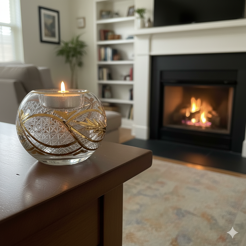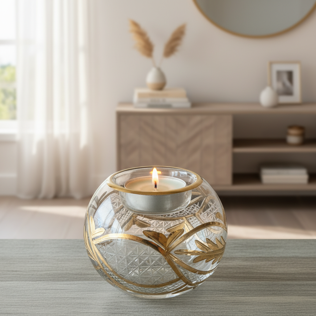 Hand-blown Egyptian glass tea light holder featuring etched clear and green glass. Each piece is individually crafted by skilled artisans, creating a unique swirl pattern that diffuses warm, ambient light. Perfect for side tables, nightstands, or dining centerpieces. Durable and beautifully designed for lasting elegance.