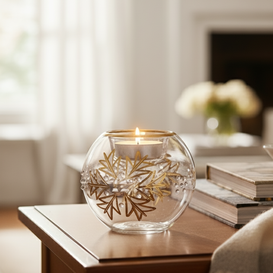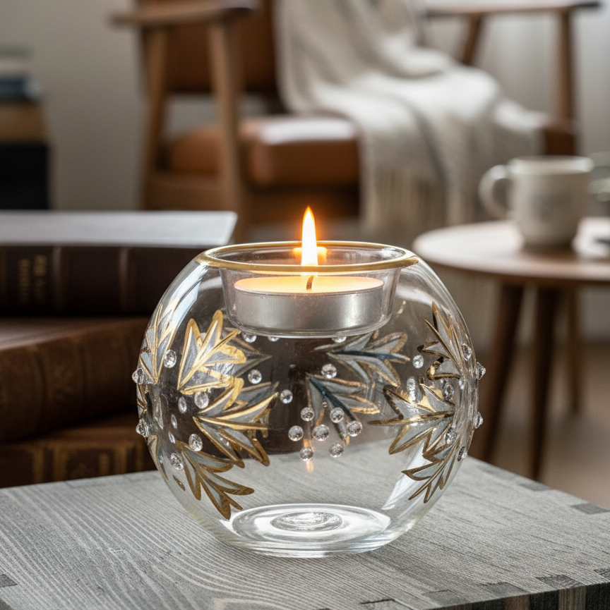 Crafted by Egyptian artisans, this hand-blown glass tea light holder showcases the delicate artistry of traditional glassmaking. Each piece features an intricate floral design with subtle surface textures that catch and diffuse light beautifully, creating a warm, atmospheric glow. The compact form makes it ideal for intimate spaces—bedside tables, shelves, or dining surfaces—while its refined construction promises lasting elegance. A sophisticated accent that brings handmade authenticity and soft illumination to any room.