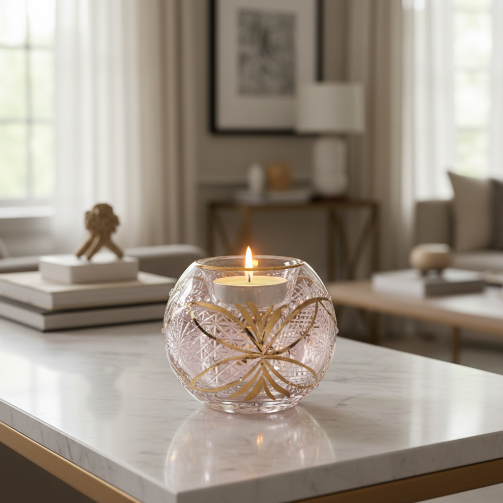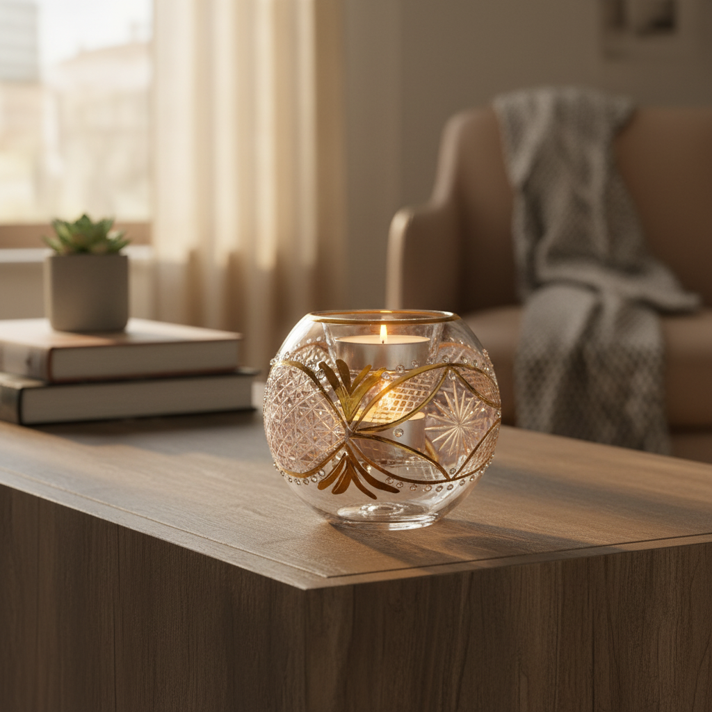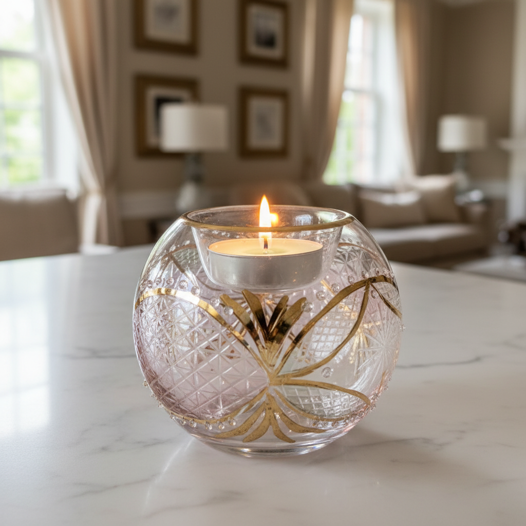 Crafted by Egyptian artisans, this hand-blown glass tea light holder merges traditional glassmaking with contemporary design. The pink and green hues create a striking visual presence, while the intricate swirl patterns etched throughout the glass add sophisticated texture and depth. When lit, the translucent glass diffuses light beautifully, producing a warm, atmospheric glow ideal for intimate settings. Its compact proportions make it equally suited to bedside tables, shelving displays, or dining arrangements. Built to withstand daily use, this piece combines artistic craftsmanship with practical elegance for discerning collectors and design enthusiasts.
