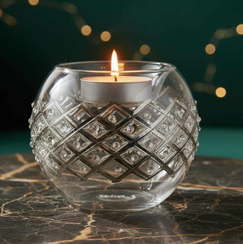 This hand-blown glass tea light holder showcases authentic Egyptian craftsmanship, with each piece individually created by skilled artisans. The silver-toned glass features an intricate swirl pattern that catches light beautifully, producing a warm, diffused glow perfect for intimate settings. Its compact design makes it ideal for bedside tables, shelving, or dining surfaces, while the quality construction ensures lasting appeal. A refined accent piece that brings both elegance and atmospheric lighting to any room.