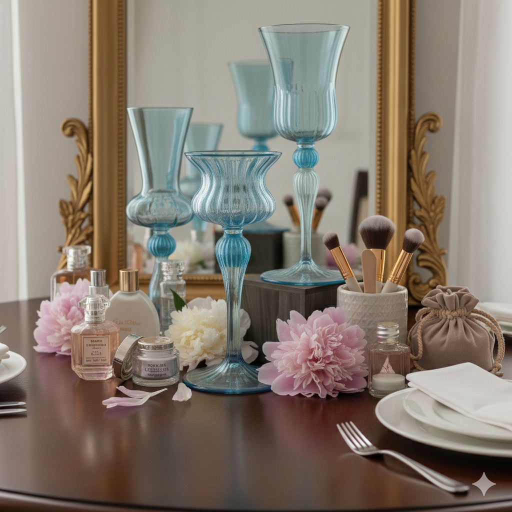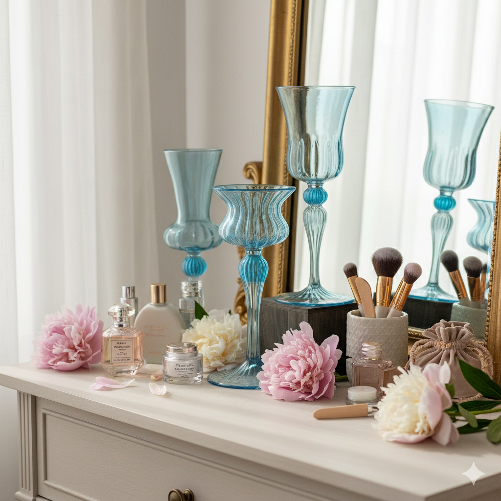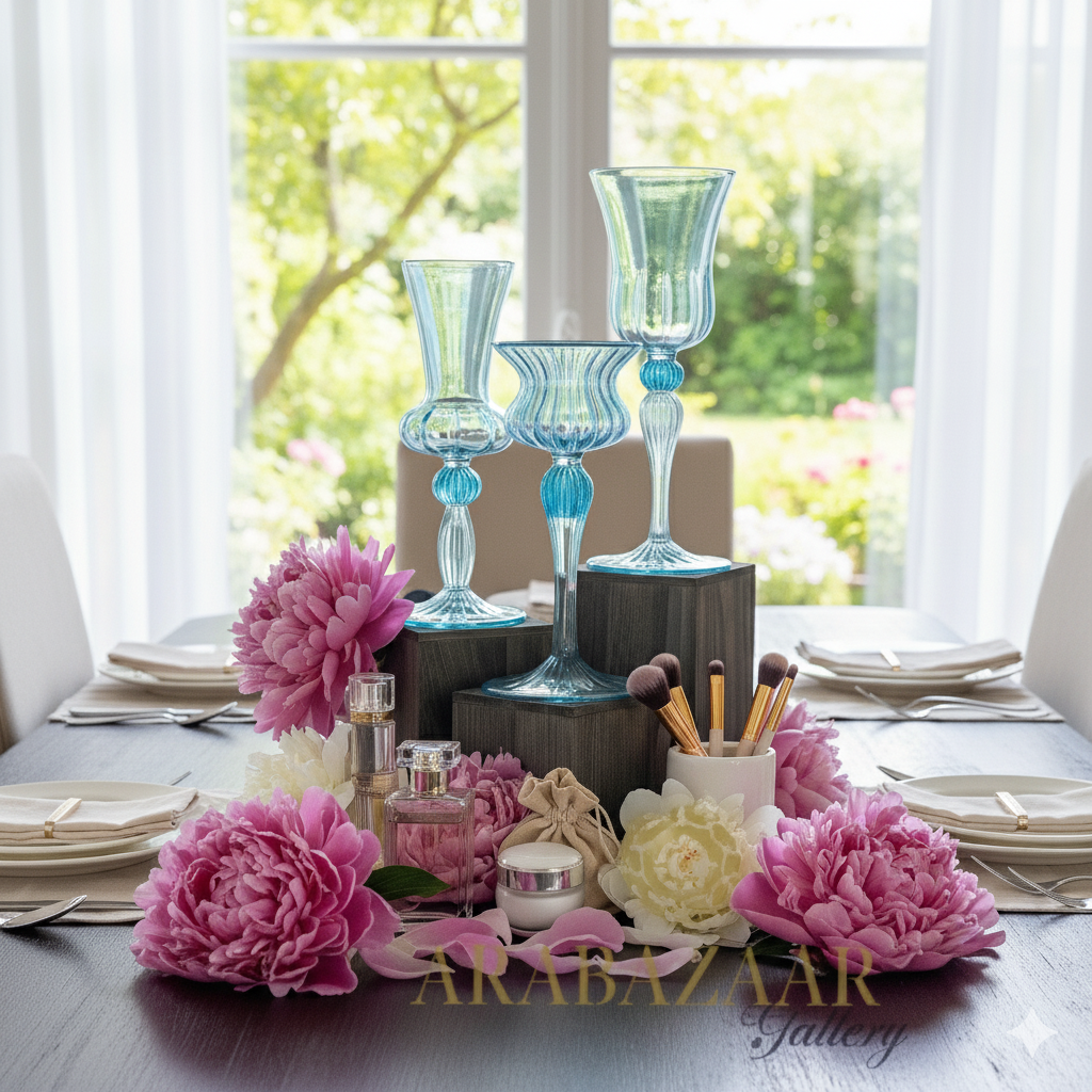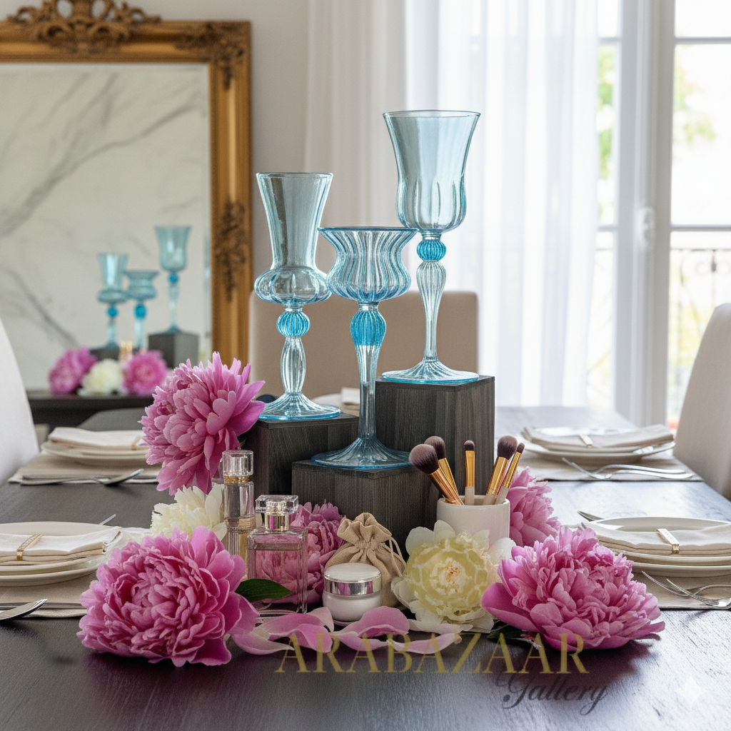Each goblet in this set of three is individually handblown from aqua glass, showcasing the signature swirl pattern that defines Egyptian artisanal craftsmanship. Ranging from 8 to 10 inches in height, these pieces elevate any table setting—from formal dinners to intimate gatherings. Crafted entirely in-house and trademarked, they arrive gift-boxed with protective bubble wrapping. Hand wash only to preserve the glass integrity. Natural variations in color and subtle surface characteristics are inherent to the handmade process and add to each piece's authenticity.