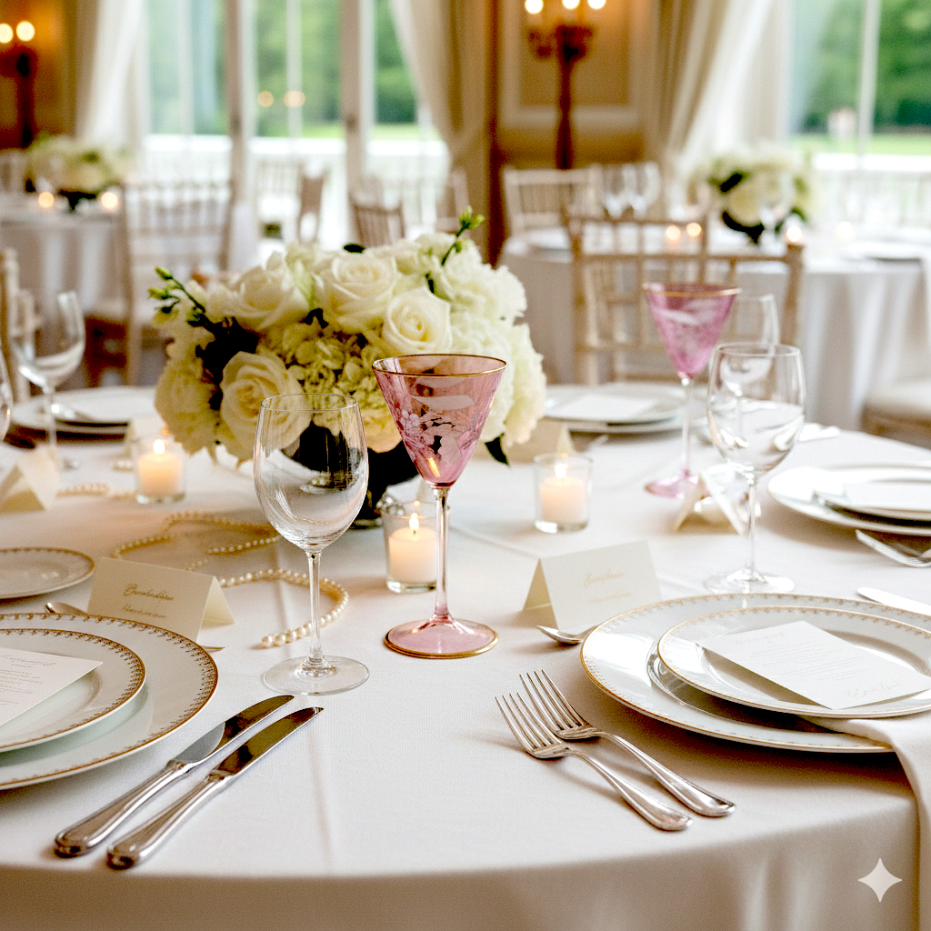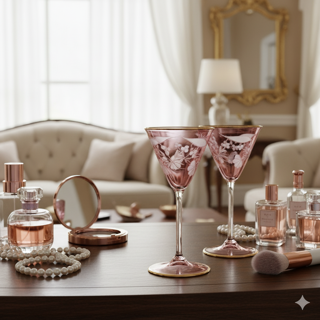 Each goblet in this set showcases artisanal handblown glass craftsmanship, featuring delicate etched detailing and a refined 14K gold rim. The soft pink hue shifts subtly with ambient light, creating an elegant presence on any table. Standing 7.5 inches tall, these pieces elevate formal dining, celebrations, or everyday sophistication. Hand wash only to preserve the gold lining and etched surface. Presented in protective gift packaging. Minor variations and surface characteristics are inherent to handcrafted glass art and reflect authentic artisanal production.