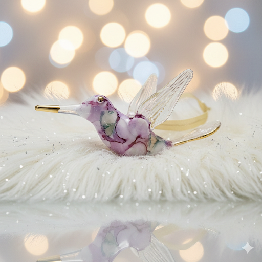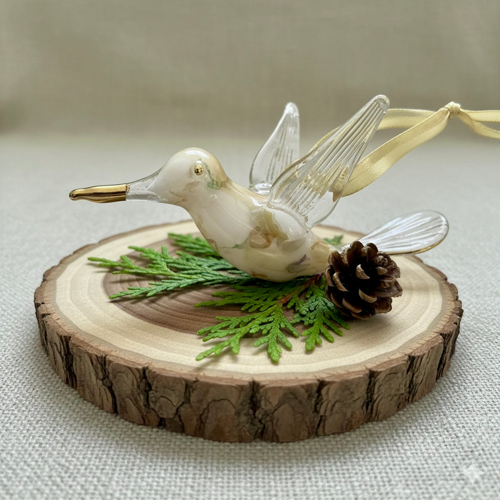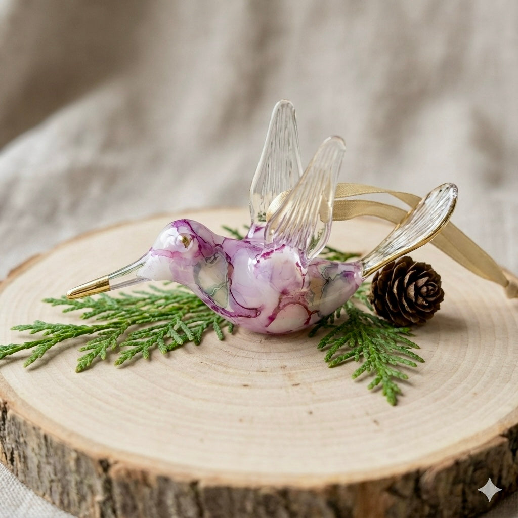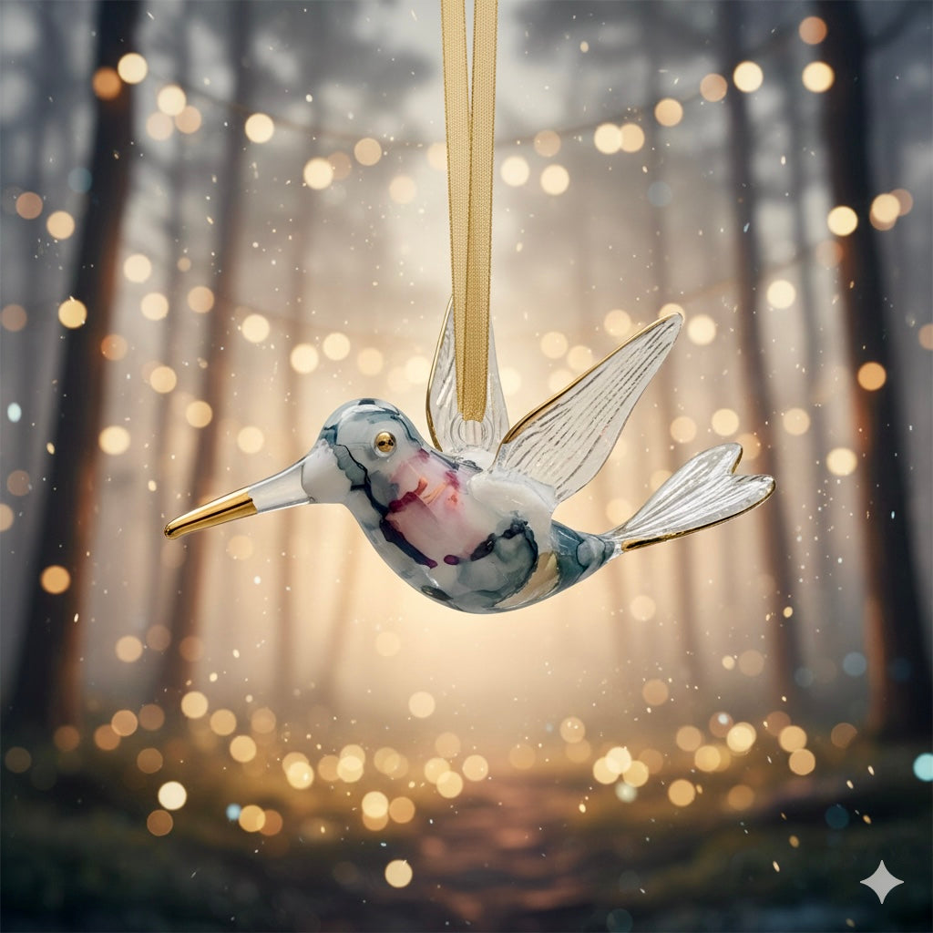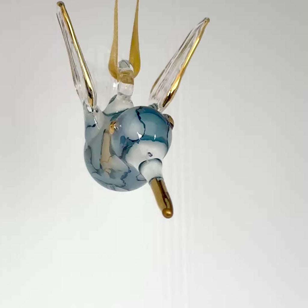 Handcrafted Humming Bird ornament made out of hand blow glass with a 14K gold trim on beak, wings and tail. Array of colors to choose from.