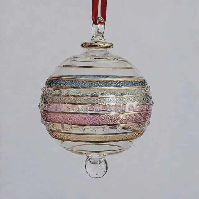 Hand-blown glass is an old-world art passed down from generation to generation to create an elegant and sophisticated work of art with attention to detail and craftmanship . This exquisite ornament is handcrafted by artisans in Egypt to create a beautiful unique piece for your enjoyment. This decorative art is made with care and pride that would be a great addition to your holiday tree.