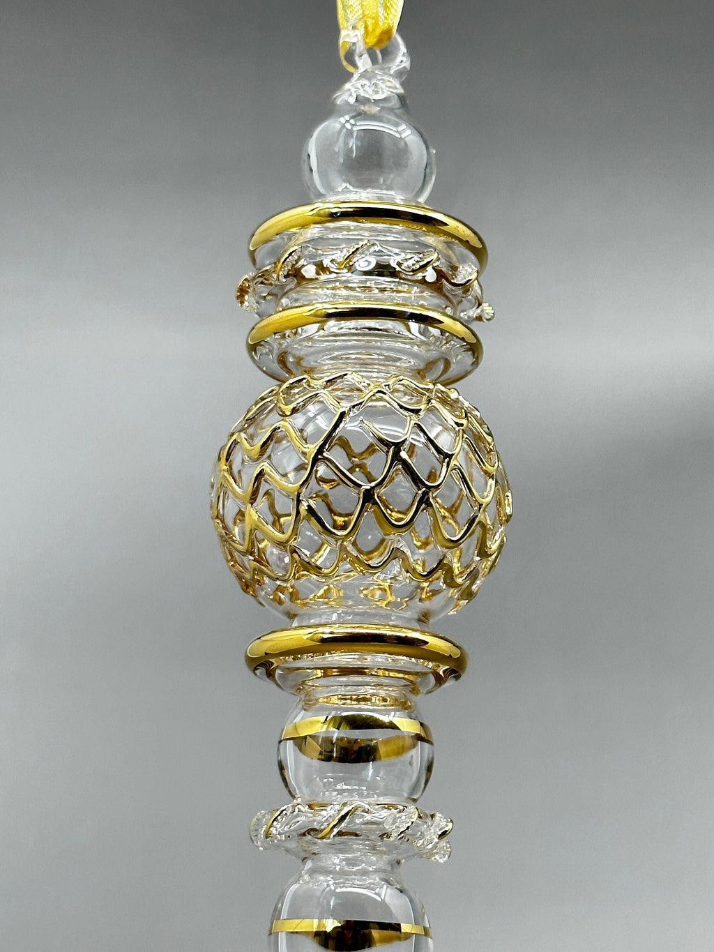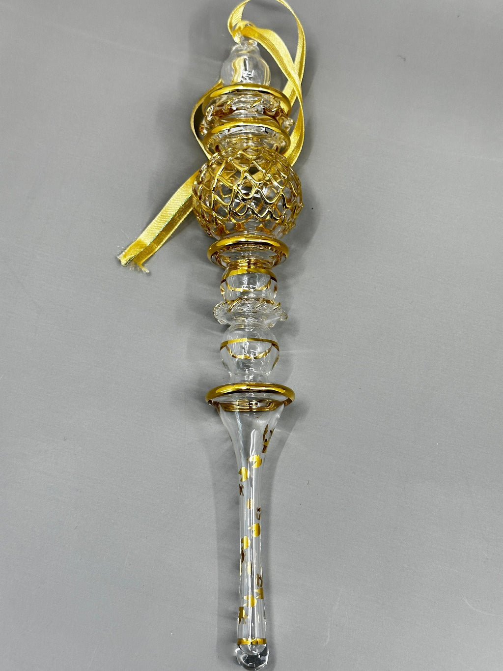 This hand-blown Egyptian glass scepter ornament merges timeless artisanal tradition with refined elegance. Each piece is meticulously crafted by skilled artisans using authentic Egyptian glass techniques, then accented with 14K gold detailing for a luxurious finish. The scepter's graceful silhouette captures light beautifully, with color depth that shifts subtly depending on your viewing angle—a hallmark of genuine hand-blown craftsmanship. Perfect for elevating your holiday display or presenting as a meaningful gift, this ornament represents generations of glassmaking expertise. Minor variations and surface characteristics are inherent to the handmade process, ensuring each piece is genuinely one-of-a-kind.