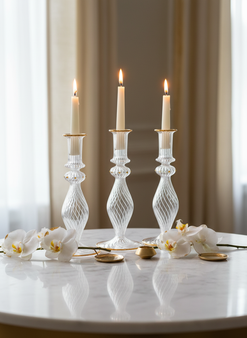 These handcrafted candle stick holders are meticulously formed from premium handblown glass, featuring our distinctive Sphere/Oval Swirl pattern in a single sophisticated colorway. Ideal for refined table presentations and special events alike, they invite creative styling through thoughtful pairing with complementary pieces. Each holder's appearance evolves with ambient lighting, revealing the depth and richness of the glass composition. As artisanal handblown creations, minor surface variations and subtle irregularities are natural characteristics that distinguish each piece, reflecting the authentic craftsmanship inherent to the medium.