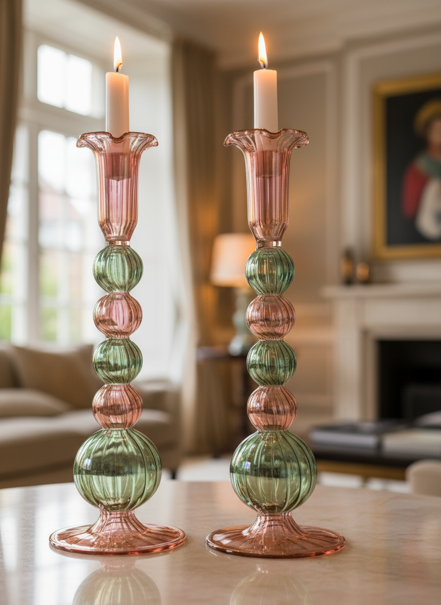 Each piece in this set of two candle holders showcases the timeless artistry of hand-blown glass, crafted by skilled artisans in Egypt. The distinctive swirl texture flows across soft pink and green tones, creating visual depth that shifts beautifully with changing light. Rooted in centuries-old glassmaking tradition, these holders combine functional elegance with artistic sophistication—ideal for refined table settings or as standalone decorative statements. As handcrafted works, minor variations and subtle imperfections are inherent to their creation, underscoring their authentic, one-of-a-kind character.