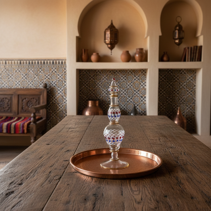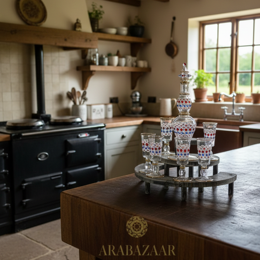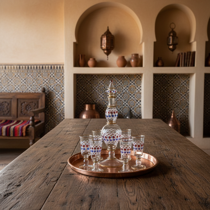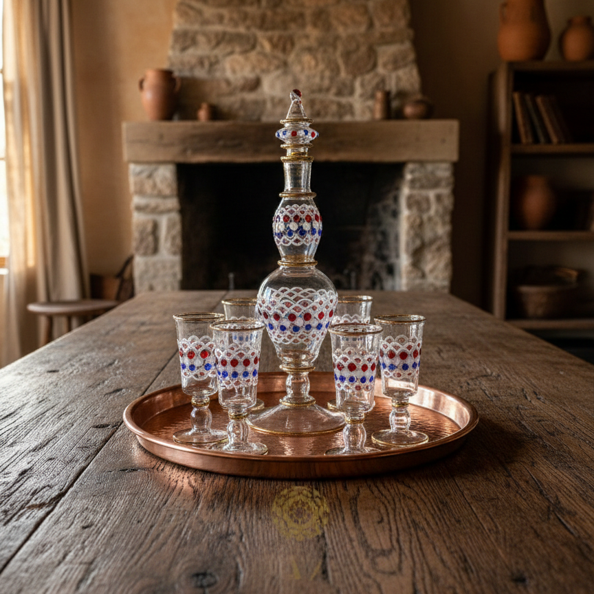 Crafted by Egyptian artisans using time-honored glassblowing techniques, this seven-piece drinking set showcases geometric and dot patterns with elegant 14K gold trim accents. Each handblown vessel is individually unique, featuring natural color variations that shift beautifully in different lighting. The durable, high-quality glass resists everyday wear while maintaining its refined aesthetic—equally striking as functional drinkware or decorative display pieces. The decanter measures approximately 14 inches; glasses stand about 6 inches tall. Hand wash only to preserve the artisanal finish. Arrives gift-boxed with protective bubble wrapping. Minor variations and subtle imperfections are inherent to handcrafted glass art and reflect authentic artisanal production.