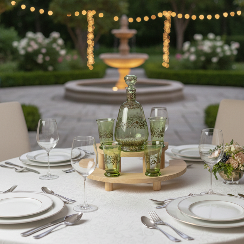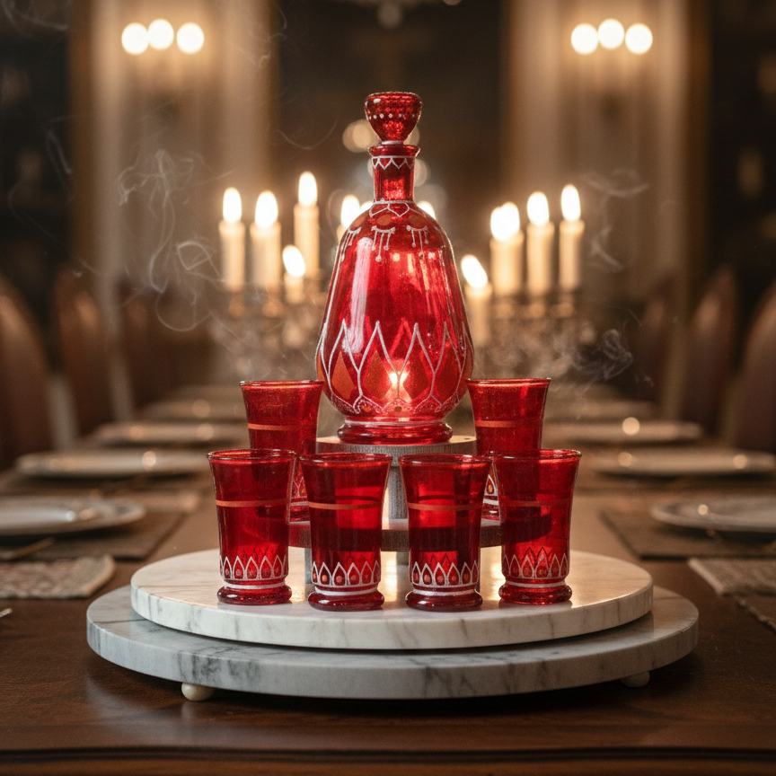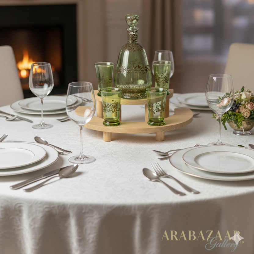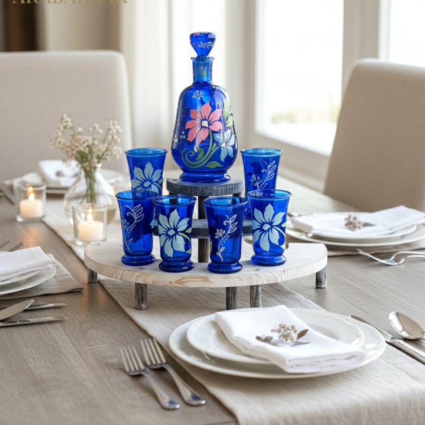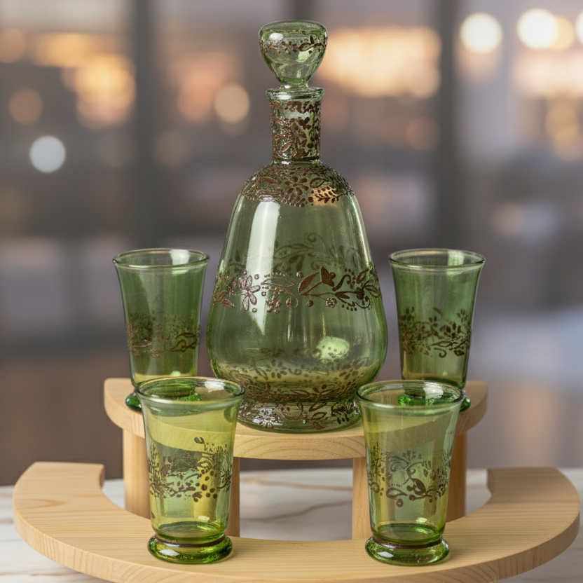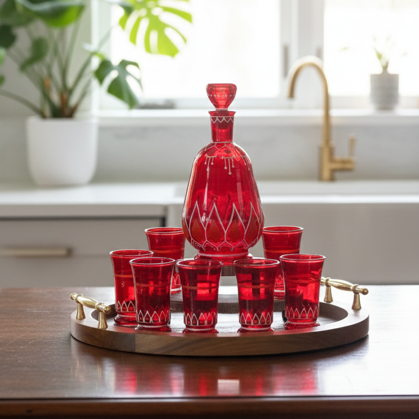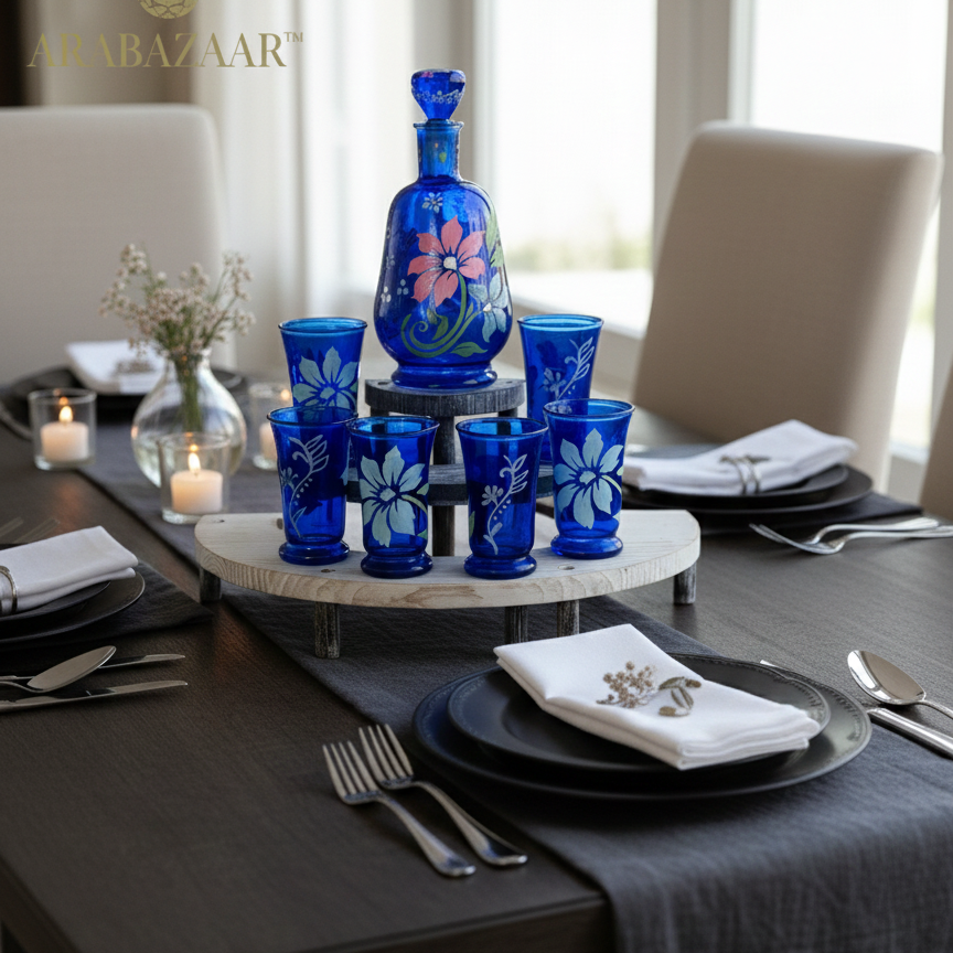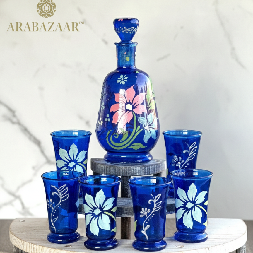 This one-of-a-kind Egyptian drinking set showcases generations of artisanal glassmaking heritage, with each of the seven pieces individually crafted by master artisans. The high-quality glass construction delivers both durability and visual sophistication—a functional serving set that doubles as sculptural décor. The minimalist silhouette complements any table setting while the handblown character ensures no two sets are identical. Bottle measures approximately 14 inches; cups approximately 5 inches. Hand wash only. Arrives gift-boxed with protective bubble wrap.
