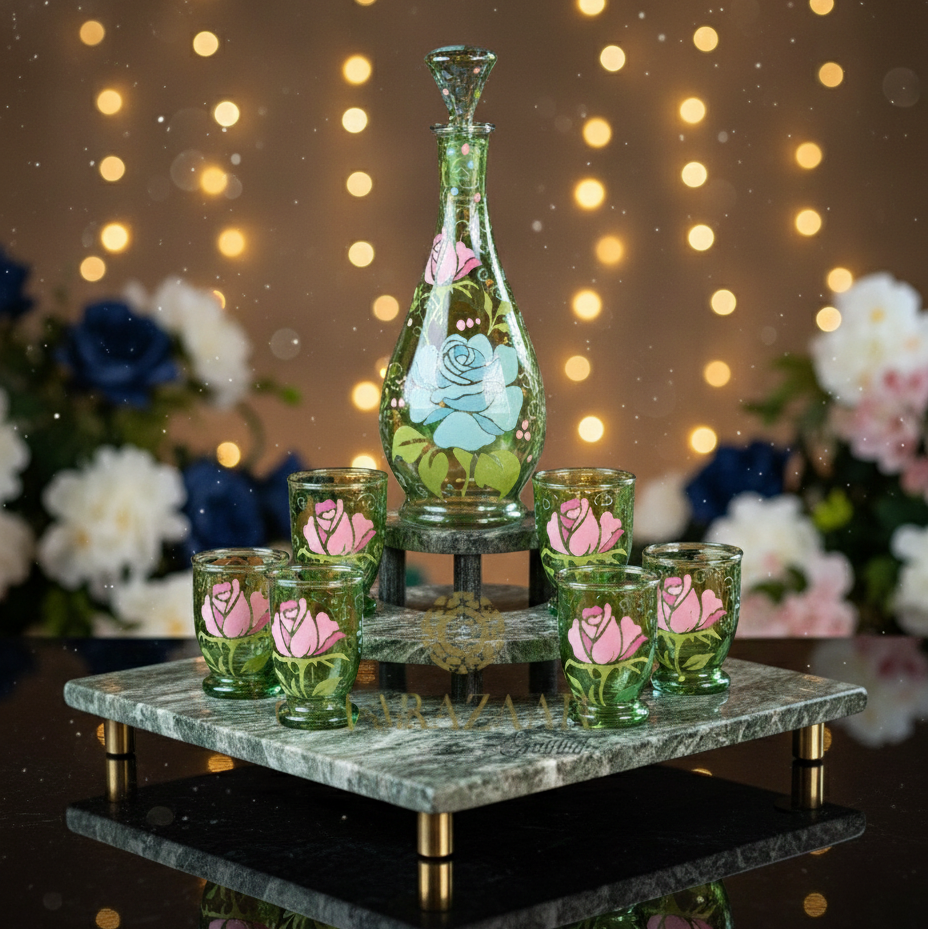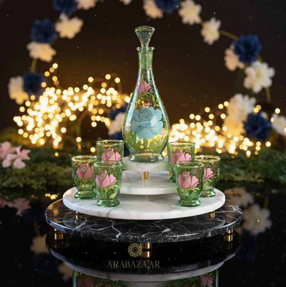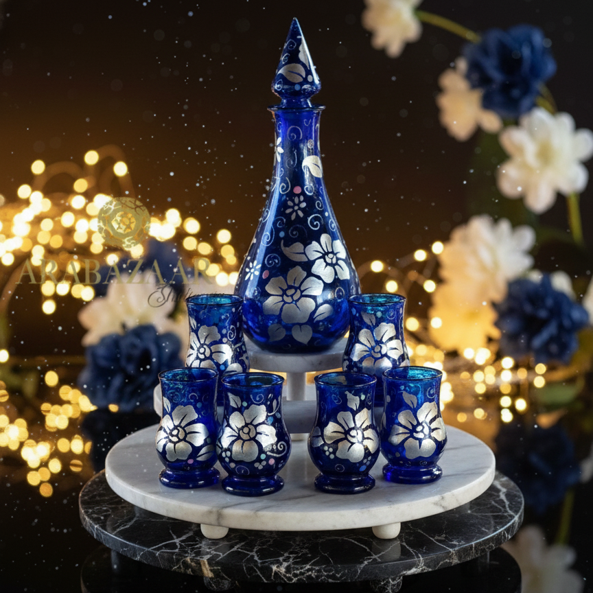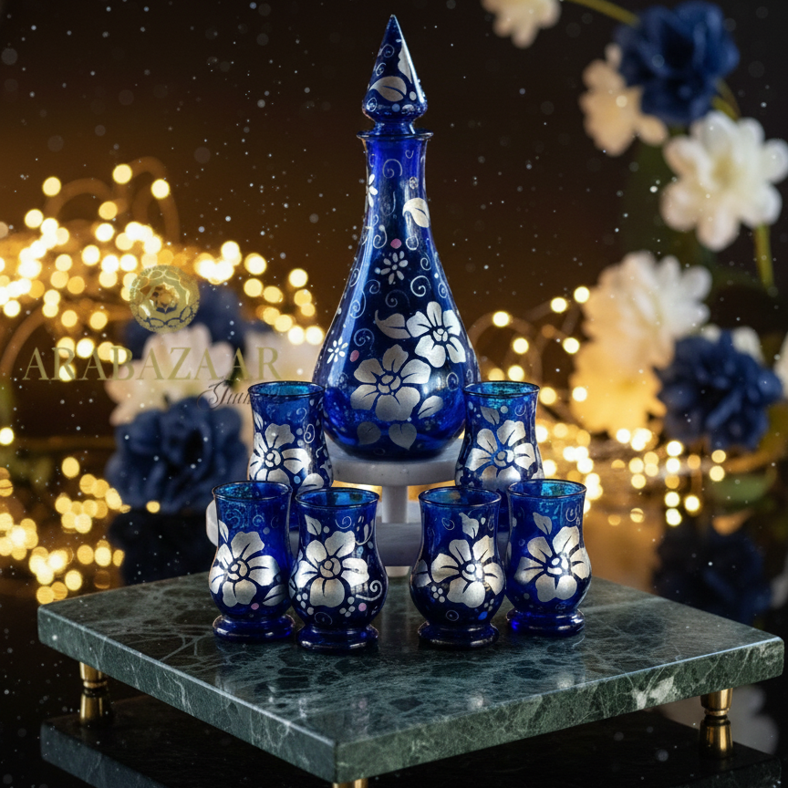 Handcrafted in Egypt by master artisans, this seven-piece drinking set showcases generations of glassmaking heritage. Each piece is individually blown and hand-painted with the distinctive Othman design, creating authentic variations that make every set truly one-of-a-kind. The durable, high-quality glass resists everyday wear while maintaining its elegant clarity. The minimalist silhouette works equally well for daily use or as a sculptural display piece. Bottle measures approximately 14 inches; cups approximately 5 inches. Hand wash only. Arrives gift-boxed with protective bubble wrap. Note: Slight variations in color and minor imperfections are inherent to handcrafted glass and reflect its artisanal nature.