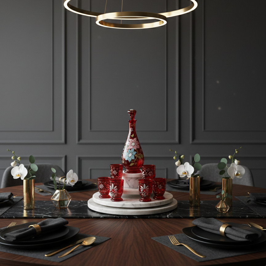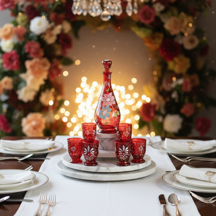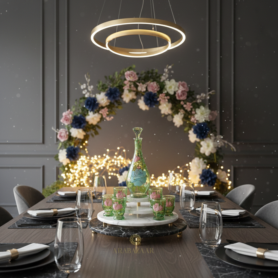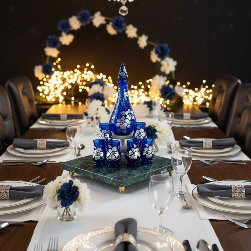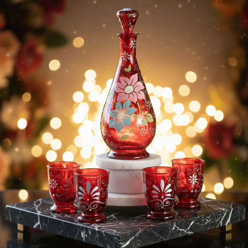 Handcrafted in Egypt by master artisans, this seven-piece drinking set showcases generations of glassmaking heritage. Each piece is individually blown and hand-painted with the distinctive Othman design, creating authentic variations that make every set truly one-of-a-kind. The durable, high-quality glass resists everyday wear while maintaining its elegant clarity. The minimalist silhouette works equally well for daily use or as a sculptural display piece. Bottle measures approximately 14 inches; cups approximately 5 inches. Hand wash only. Arrives gift-boxed with protective bubble wrap. Note: Slight variations in color and minor imperfections are inherent to handcrafted glass and reflect its artisanal nature.