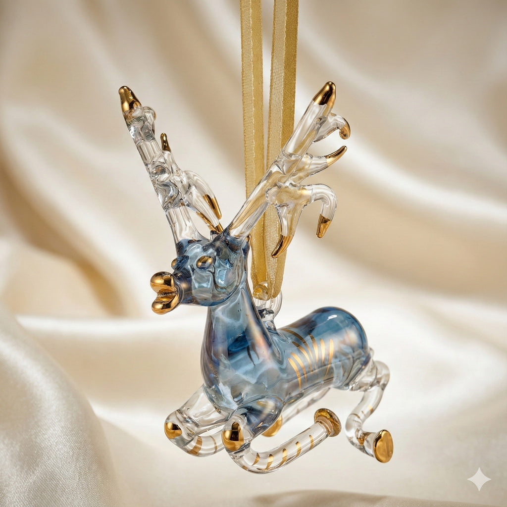 Handcrafted Reindeer ornament made out of hand blow glass with a 14K gold accent. Array of colors to choose from.